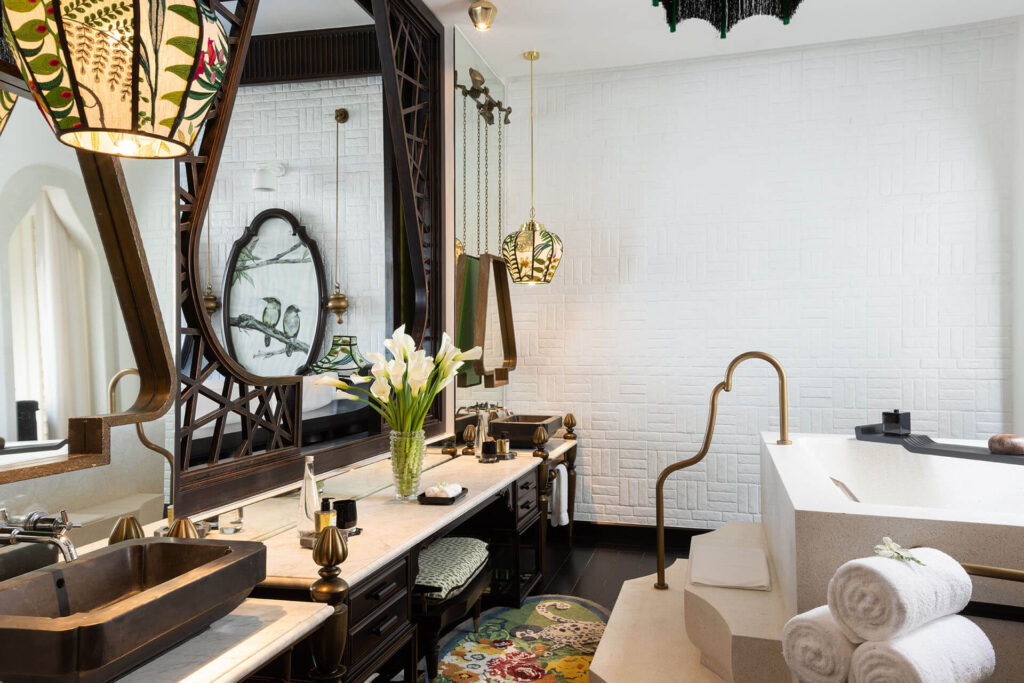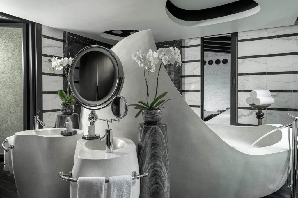 - Phòng tắm rộng rãi được thiết kế với bồn rửa đôi, buồng tắm vòi sen và bồn tắm được chế tác bằng đá cẩm thạch có hình dáng quả trứng hoặc những bồn tắm cỡ lớn dành cho các cặp đôi.