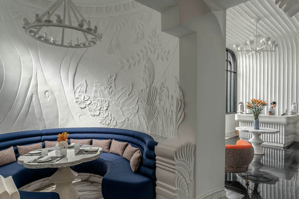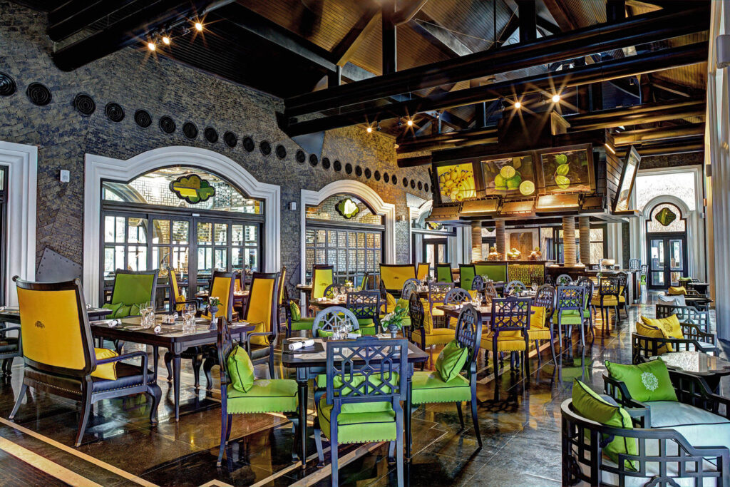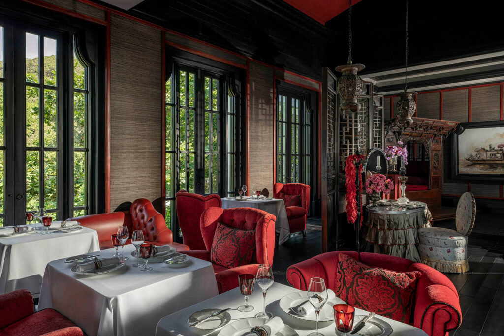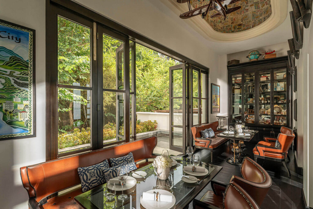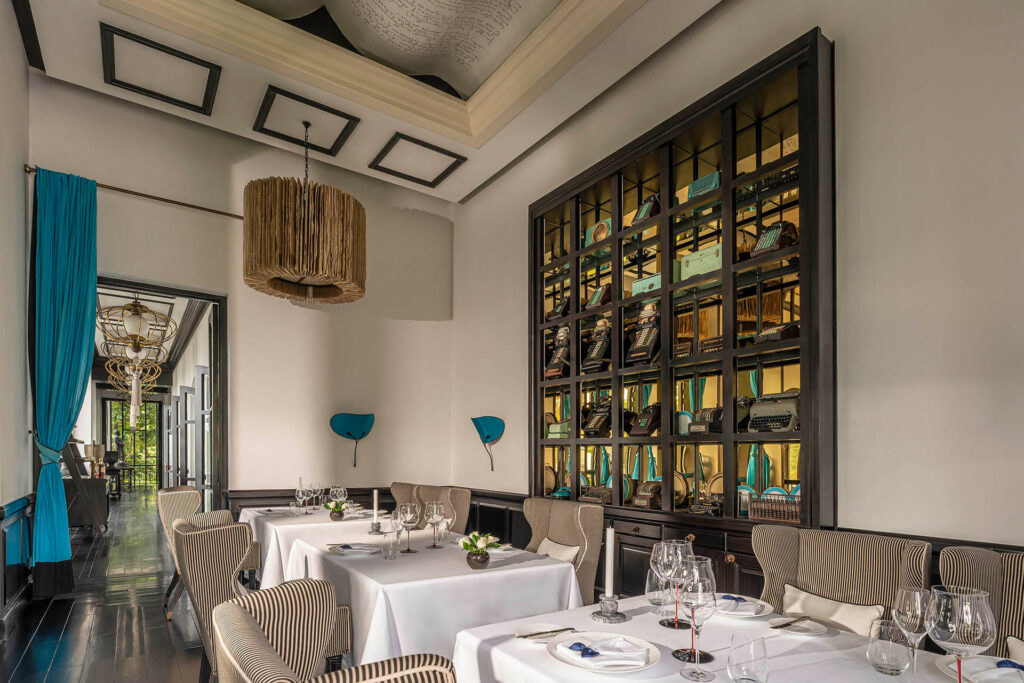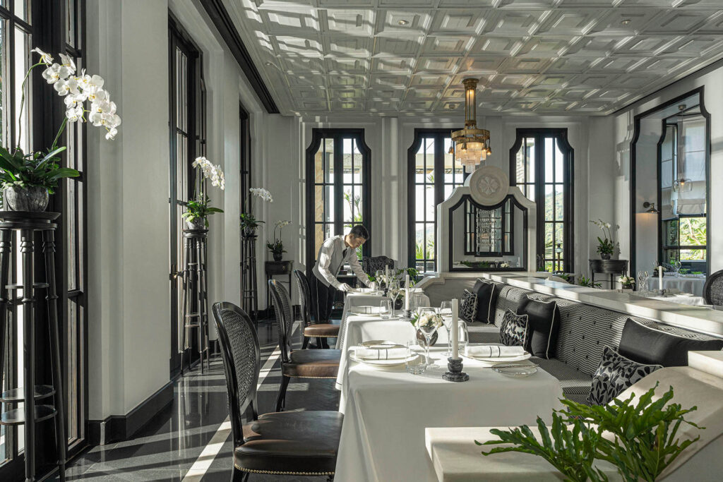 - Các phòng ăn được thiết kế tinh tế với kiến trúc lấy cảm hứng từ thời kỳ Pháp được tô điểm bởi màu xanh của cây cảnh và rừng nhiệt đới bên ngoài.