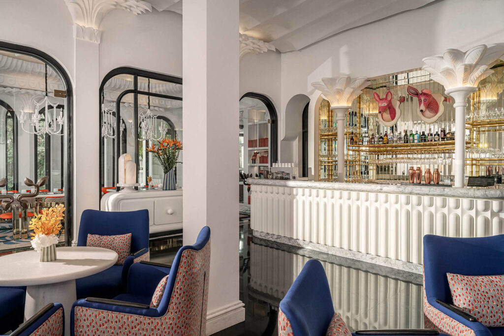 - Dọc theo chiều dài của quán bar là một dãy cột màu trắng lấy cảm hứng từ kiến trúc đền chùa Việt Nam, ngước nhìn trên trần nhà là những chiếc quạt Punkah được treo lơ lửng, nhẹ nhàng phe phẩy.