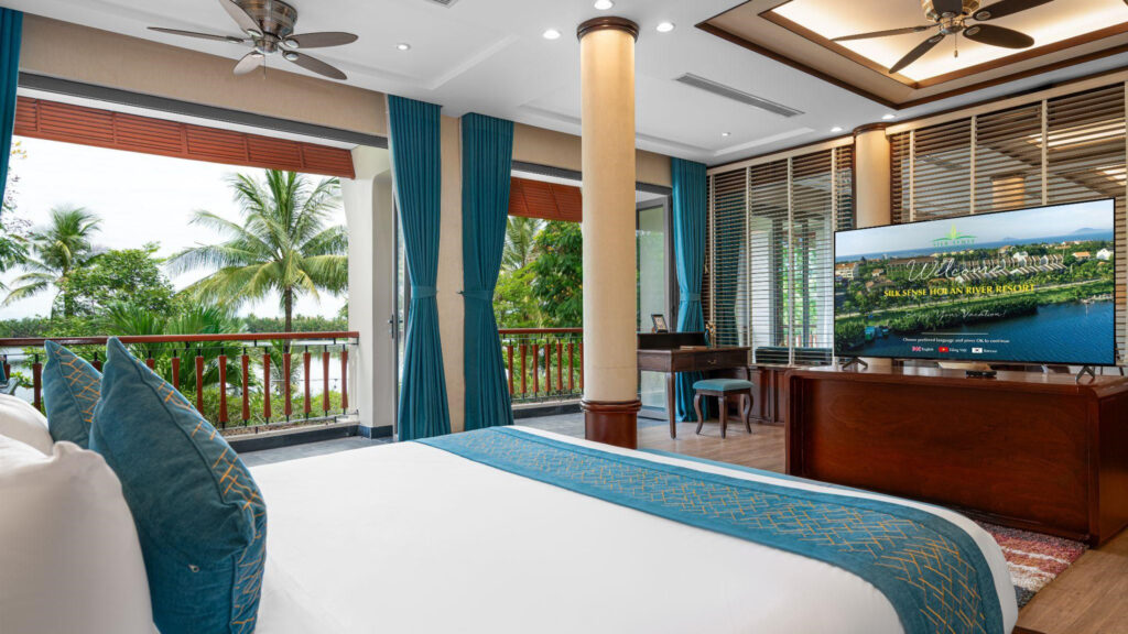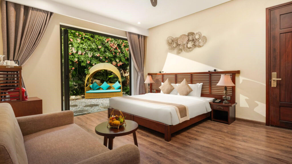 Mỗi căn phòng được thiết kế mở – đón ánh sáng tự nhiên và làn gió trời len lỏi vào từng góc nhỏ. Gam màu trung tính tạo nên một tổng thể hài hòa, ấm áp và dễ chịu. Từ ban công rộng thoáng, tầm nhìn trải dài ra khu vườn xanh mát, hồ bơi trong veo hay dòng sông êm đềm – nơi du khách có thể lặng lẽ cảm nhận nhịp chuyển của thời gian: từ ánh nắng ban mai dịu nhẹ, hoàng hôn rực rỡ sắc vàng đến màn đêm tĩnh lặng.