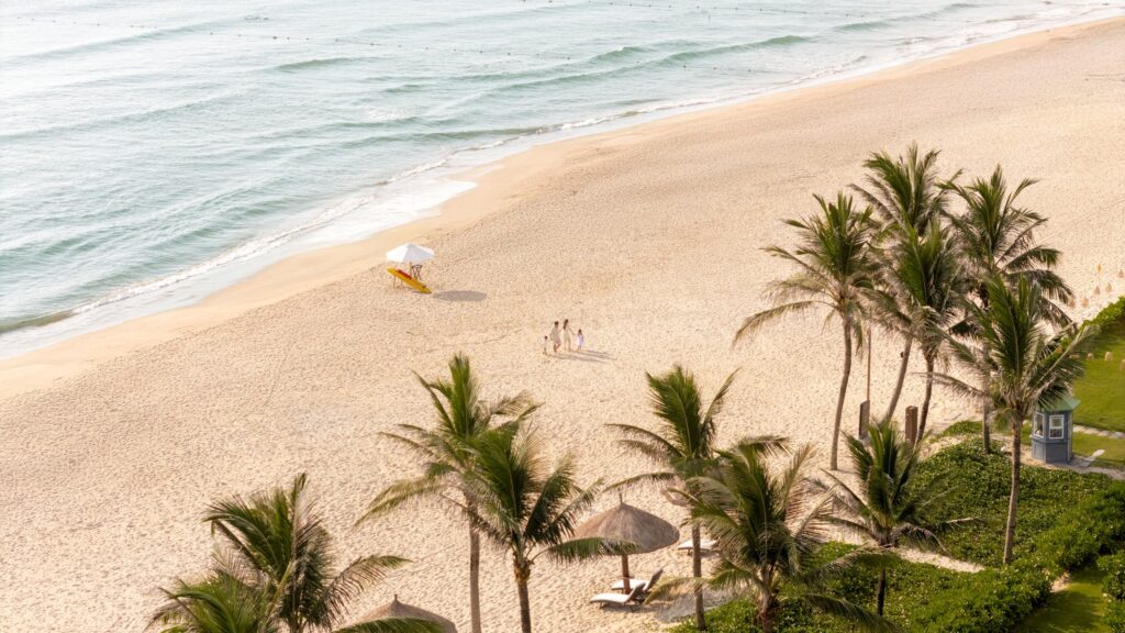 Không chỉ sở hữu vẻ đẹp tự nhiên, khu vực Biển Non Nước còn được xem là nơi hội tụ nhiều khu nghỉ dưỡng biển sang trọng bậc nhất Đà Nẵng. Dọc theo tuyến đường ven biển, các resort 5 sao được bố trí hài hòa trong không gian xanh, hướng biển, tạo nên một hệ sinh thái nghỉ dưỡng cao cấp nhưng vẫn giữ được sự riêng tư và gần gũi với thiên nhiên. Tại đây, du khách có thể tận hưởng một kỳ nghỉ trọn vẹn, nơi mỗi khoảnh khắc – từ bình minh trên biển đến những buổi chiều lặng gió – đều diễn ra trong sự thư thái và nhẹ nhàng rất riêng.