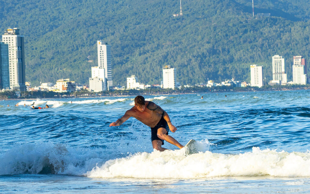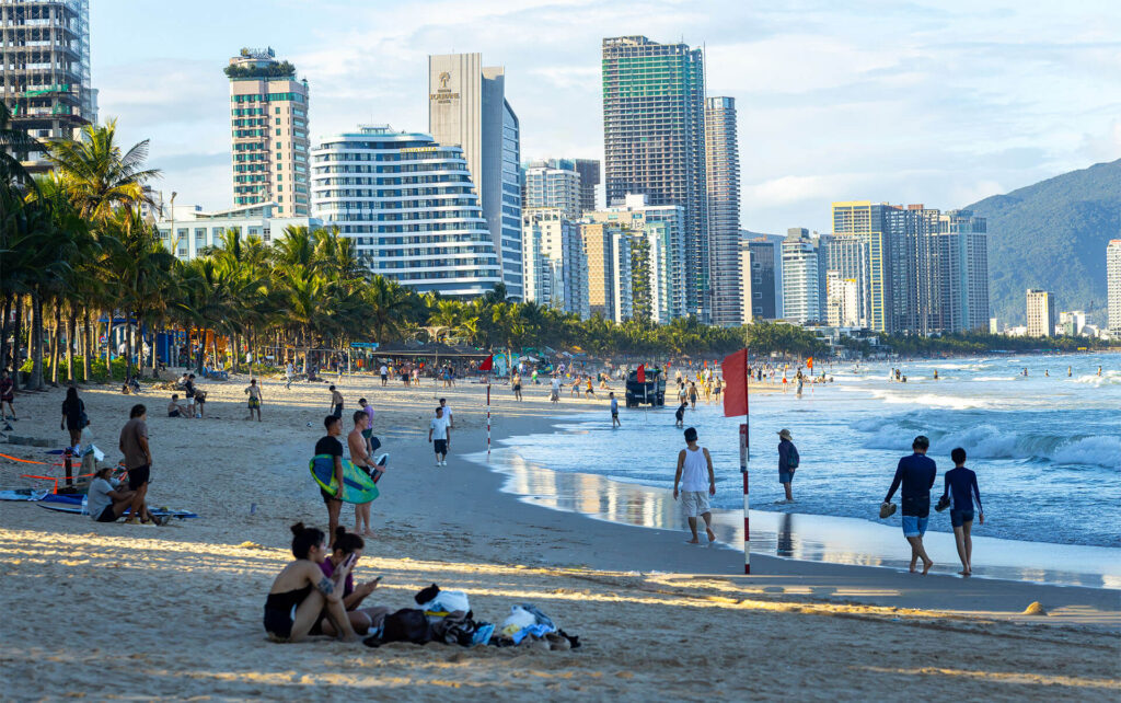 From the beach, visitors can clearly see Son Tra Peninsula and coastal structures, forming the familiar landscape of the city’s eastern shoreline.