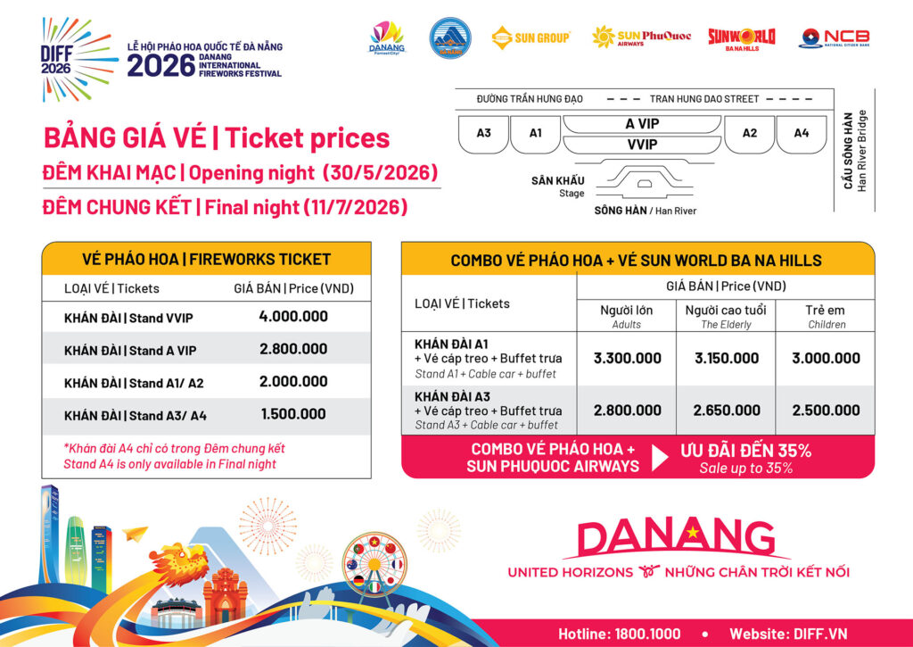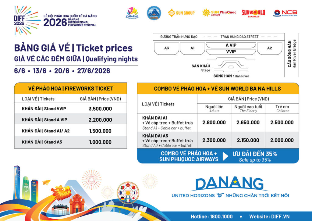 For travellers planning their trip, the DIFF 2026 ticket price and the Da Nang International Fireworks Festival 2026 schedule are among the most searched pieces of information. Ticket prices vary depending on the grandstand category and the night of competition, including the opening night, qualifying rounds and the grand finale.