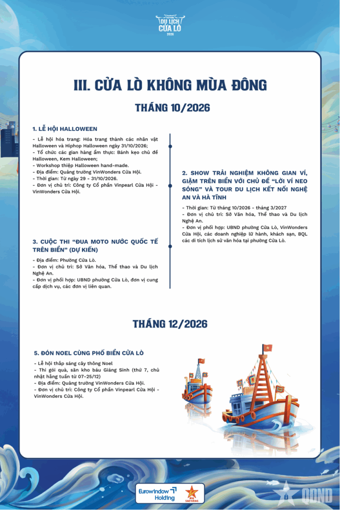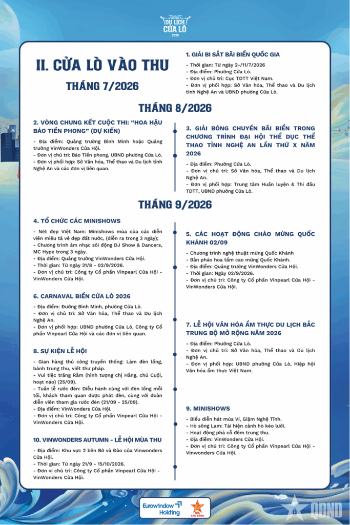 Với định hướng phát triển du lịch bền vững, Festival Du lịch Cửa Lò 2026 hứa hẹn mang đến chuỗi hoạt động phong phú, được tổ chức bài bản, đa dạng về nội dung, góp phần lan tỏa hình ảnh một Cửa Lò năng động, hiện đại nhưng vẫn đậm đà bản sắc văn hóa địa phương.