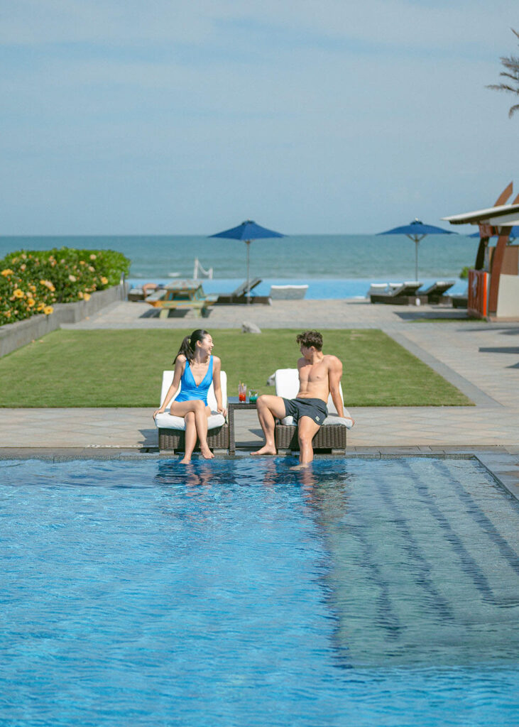 Each venue is fully equipped with state-of-the-art audiovisual systems, ready to bring every wedding vision to life. At the heart of it all is the Grand Ballroom, covering 1,267 square meters with a soaring 10-meter ceiling and a capacity of up to 1,000 guests. Its flexible design allows it to be divided into three separate spaces, accommodating everything from intimate ceremonies to grand-scale celebrations. A true highlight is the resort’s iconic infinity pool, stretching 250 meters in length, with widths ranging from 20 to 60 meters and a depth of 1.2 meters, currently holding the title as the longest in Da Nang. This remarkable venue has hosted numerous high-profile events, including extravagant weddings of Indian billionaires, and remains a favorite among celebrities and distinguished guests alike.
