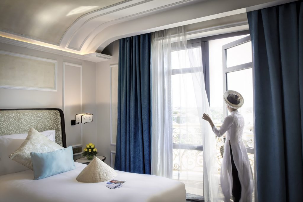 The hotel features 187 elegantly appointed rooms and suites, housed within two distinct wings named after the legendary Vietnamese–Japanese love story of Sotaro, a Japanese merchant, and Princess Ngoc Hoa – Wakaku.