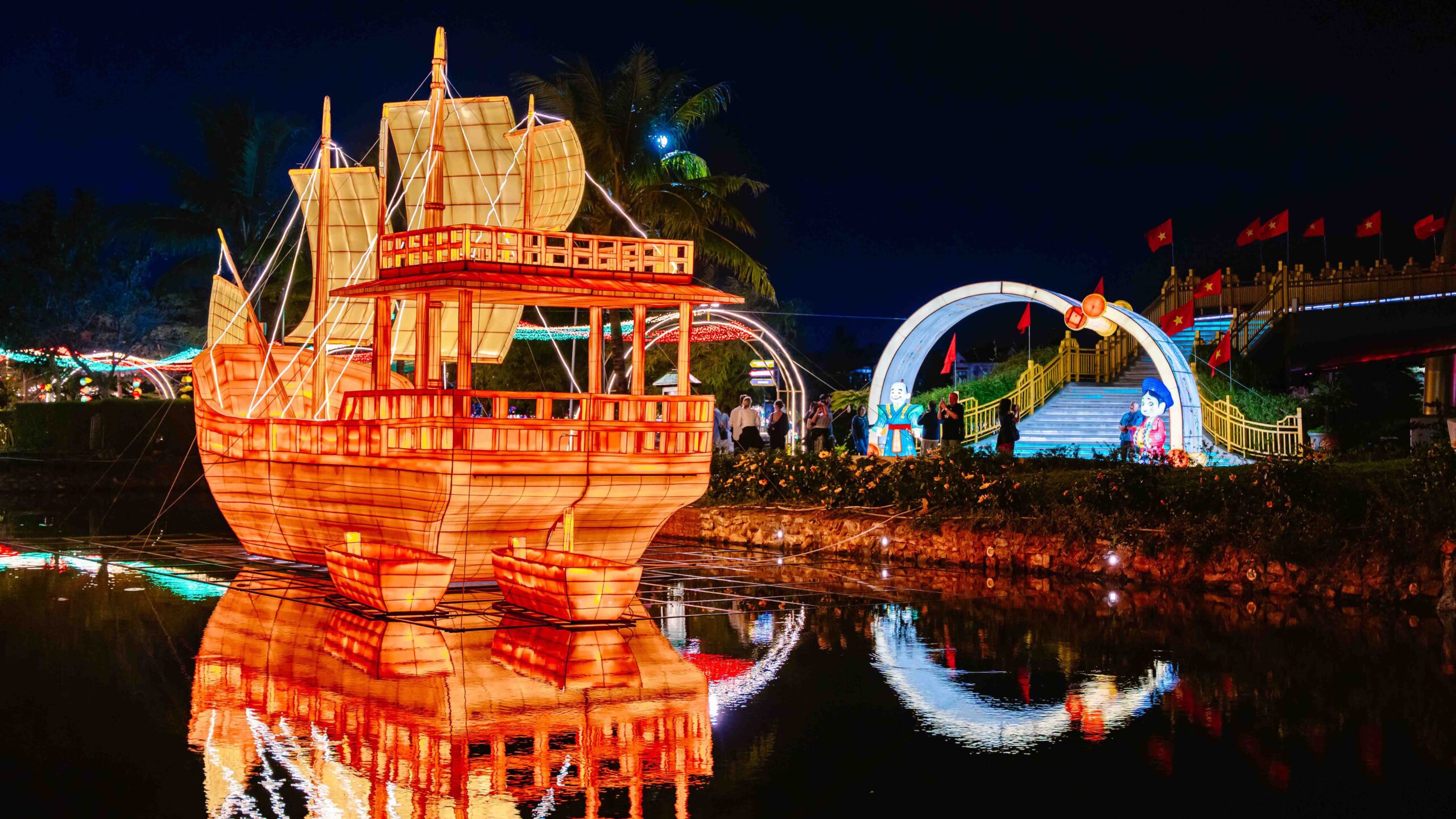 Beyond the sky, the ground of Hoi An Memories Island was equally vibrant with a giant lantern installation under the theme “Châu Ấn Thuyền – A Heritage Canvas.” The imagery of trading ships, international merchants and stories of cultural exchange was recreated through light art, forming a vivid heritage tableau at the heart of the festival.