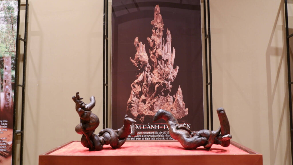 Trong không gian trưng bày, khoảng 200 mẫu vật và sản phẩm tiêu biểu từ trầm hương được giới thiệu, sắp xếp theo ba mạch nội dung: Trầm cảnh – Tinh hoa đất trời; Mỹ nghệ trầm hương; Trầm hương – Từ linh mộc đến đời sống. Du khách có thể thong thả dạo bước giữa không gian triển lãm, dừng lại lâu hơn trước từng hiện vật, hít thở mùi hương trầm dịu nhẹ để cảm nhận sự giao thoa giữa thiên nhiên, thời gian và bàn tay con người.