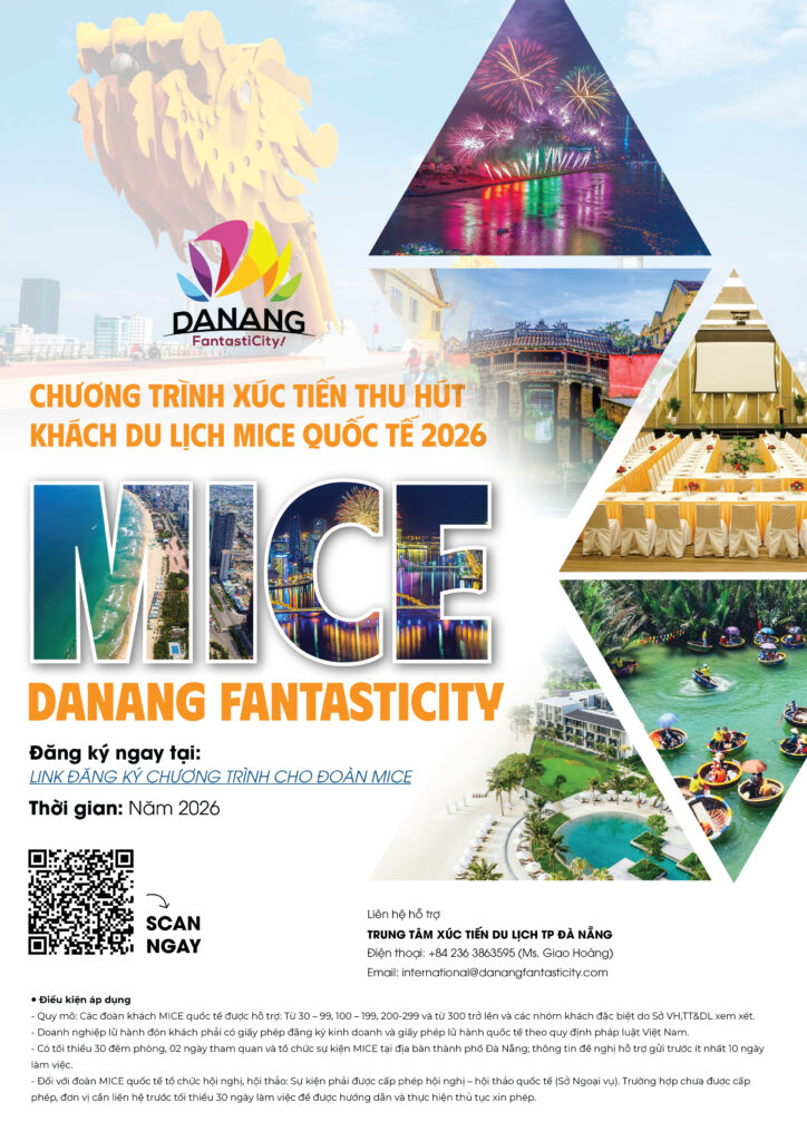 Bước sang năm 2026, Chương trình xúc tiến thu hút khách du lịch MICE đến Đà Nẵng được triển khai với chủ đề “Đà Nẵng – Nâng tầm trải nghiệm du lịch MICE” (Da Nang – Elevating your MICE experience), áp dụng từ ngày 01/01 đến 31/12/2026. Thành phố đặt mục tiêu đón và hỗ trợ gần 93.000 lượt khách MICE, tăng khoảng 12% so với năm 2025.