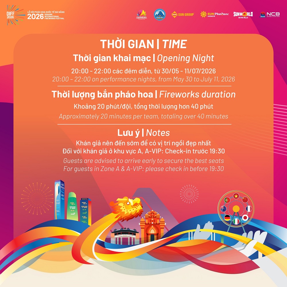 DIFF 2026 sẽ diễn ra vào các đêm trình diễn từ ngày 30/05 đến 11/07/2026, trong khung giờ 20:00 – 22:00. Mỗi đội thi sẽ mang đến phần trình diễn kéo dài khoảng 20 phút, tạo nên tổng thể hơn 40 phút pháo hoa liên tục – đủ để bầu trời Đà Nẵng chuyển mình qua nhiều cung bậc cảm xúc.