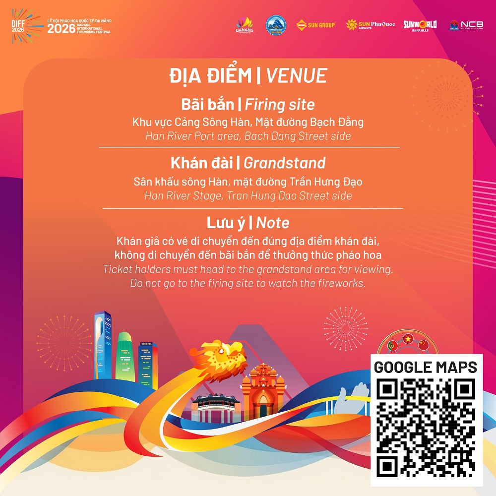 Khu vực bắn pháo hoa được bố trí tại Cảng sông Hàn (đường Bạch Đằng), trong khi khán đài chính nằm tại sân khấu bên đường Trần Hưng Đạo. Đây là hai không gian tách biệt, vì vậy khán giả cần di chuyển đúng khu vực khán đài theo vé đã mua, không di chuyển đến bãi bắn.