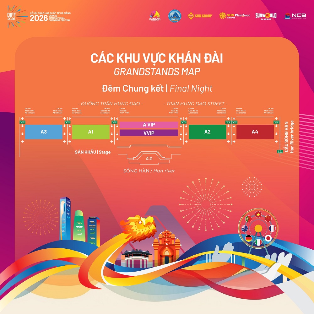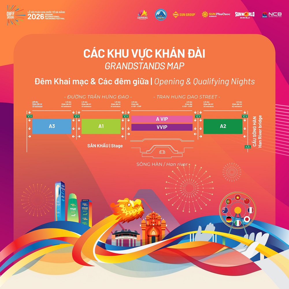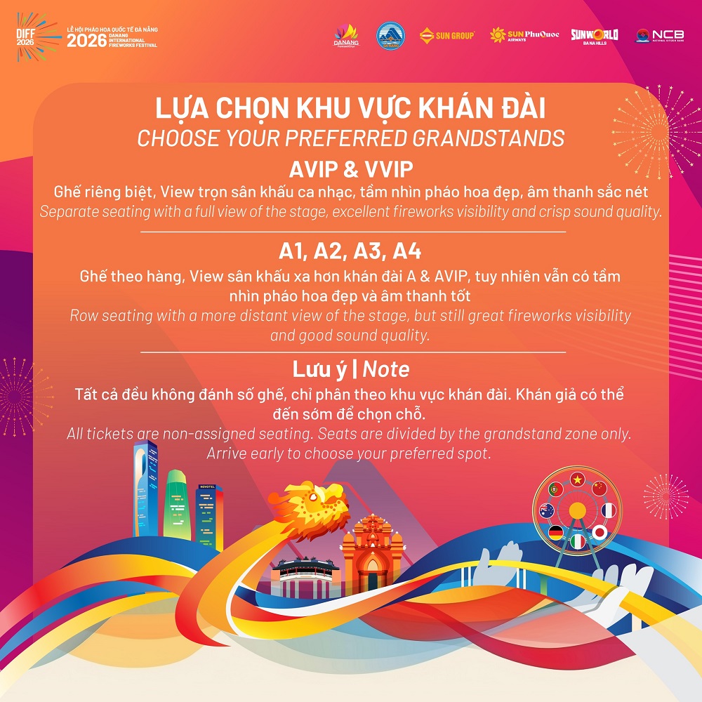 Tại DIFF 2026, mỗi khu vực khán đài mang đến một trải nghiệm khác nhau. Các khu vực AVIP và VVIP mang lại góc nhìn trực diện, trọn vẹn cả sân khấu và pháo hoa, với chất lượng âm thanh rõ nét và không gian riêng tư hơn. Trong khi đó, các khu A1, A2, A3, A4 mang đến tầm nhìn rộng, dù ở khoảng cách xa hơn nhưng vẫn đủ để cảm nhận trọn vẹn vẻ đẹp của những màn trình diễn trên bầu trời.