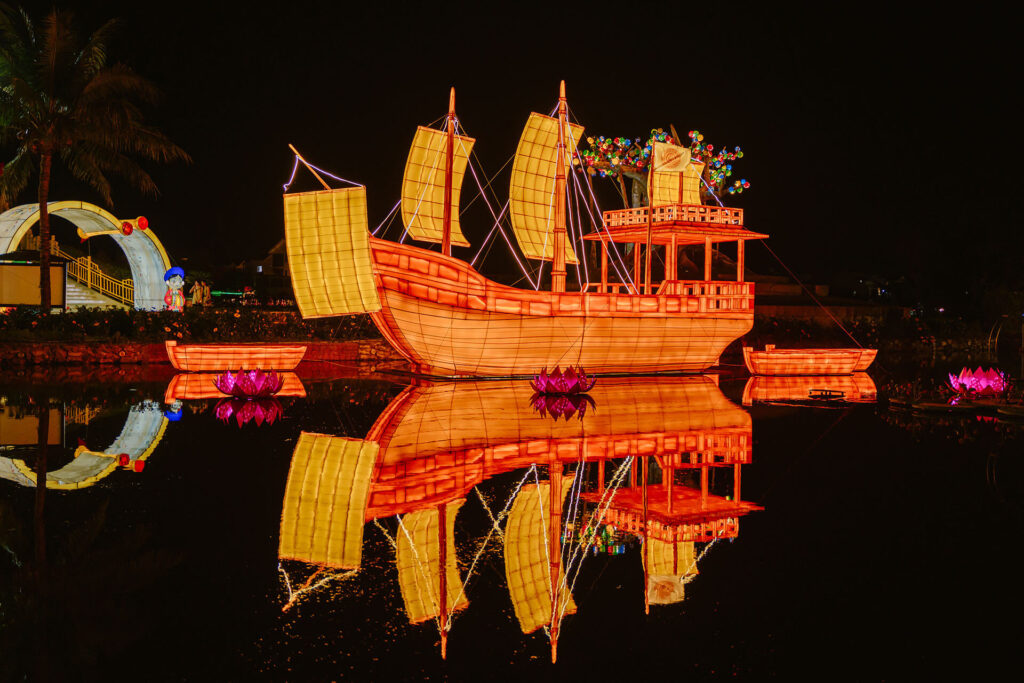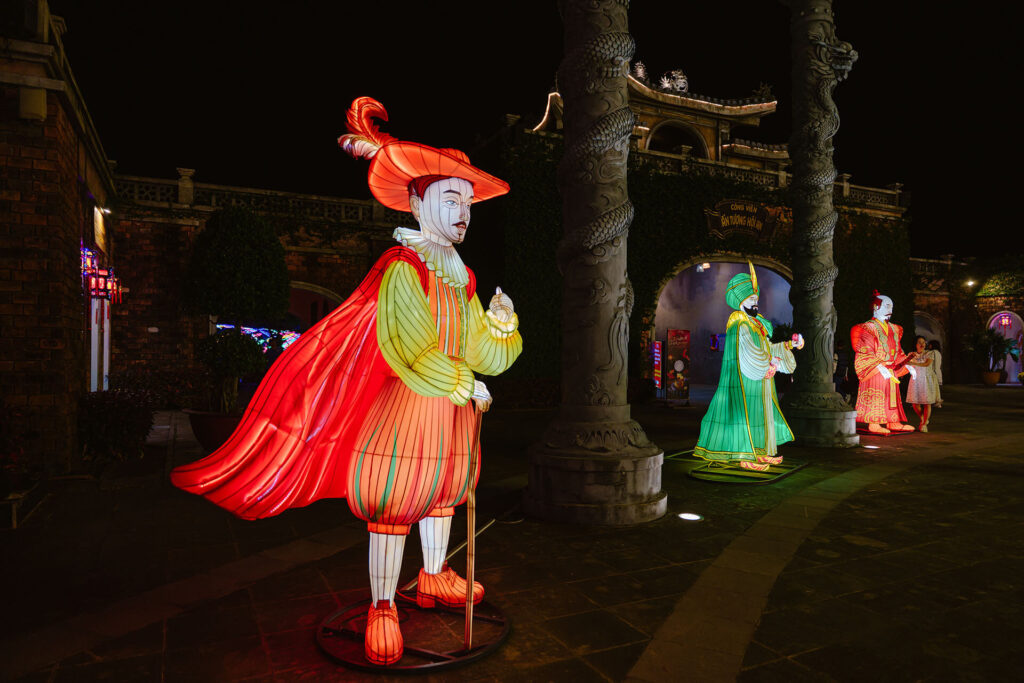 Điểm nhấn nổi bật của sự kiện là màn trình diễn đèn lồng nghệ thuật quy mô lớn với chủ đề “Châu Ấn Thuyền – Bức tranh di sản”. Hình ảnh đèn lồng khổng lồ bừng sáng giữa đêm Tết Di sản không chỉ tạo nên khoảnh khắc thị giác ấn tượng, mà còn gợi nhắc về thời kỳ hưng thịnh của thương cảng Hội An – nơi giao thoa văn hoá Đông – Tây trong lịch sử. Sự kết hợp giữa biểu tượng truyền thống và ngôn ngữ trình diễn ánh sáng đã tạo nên dấu ấn đặc biệt cho mùa Tết năm nay.