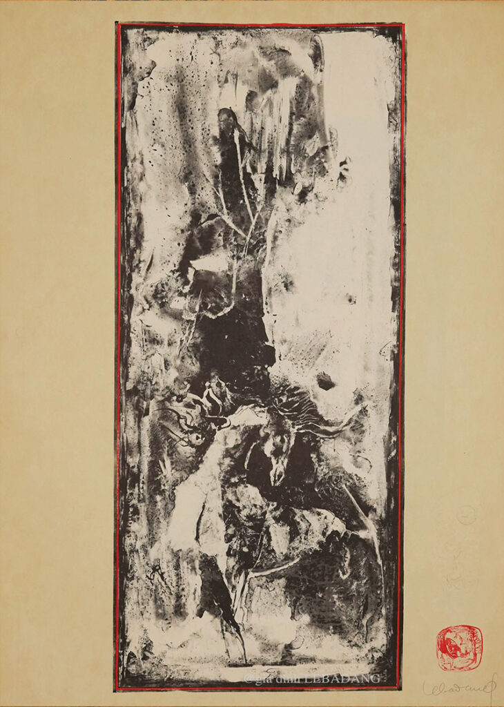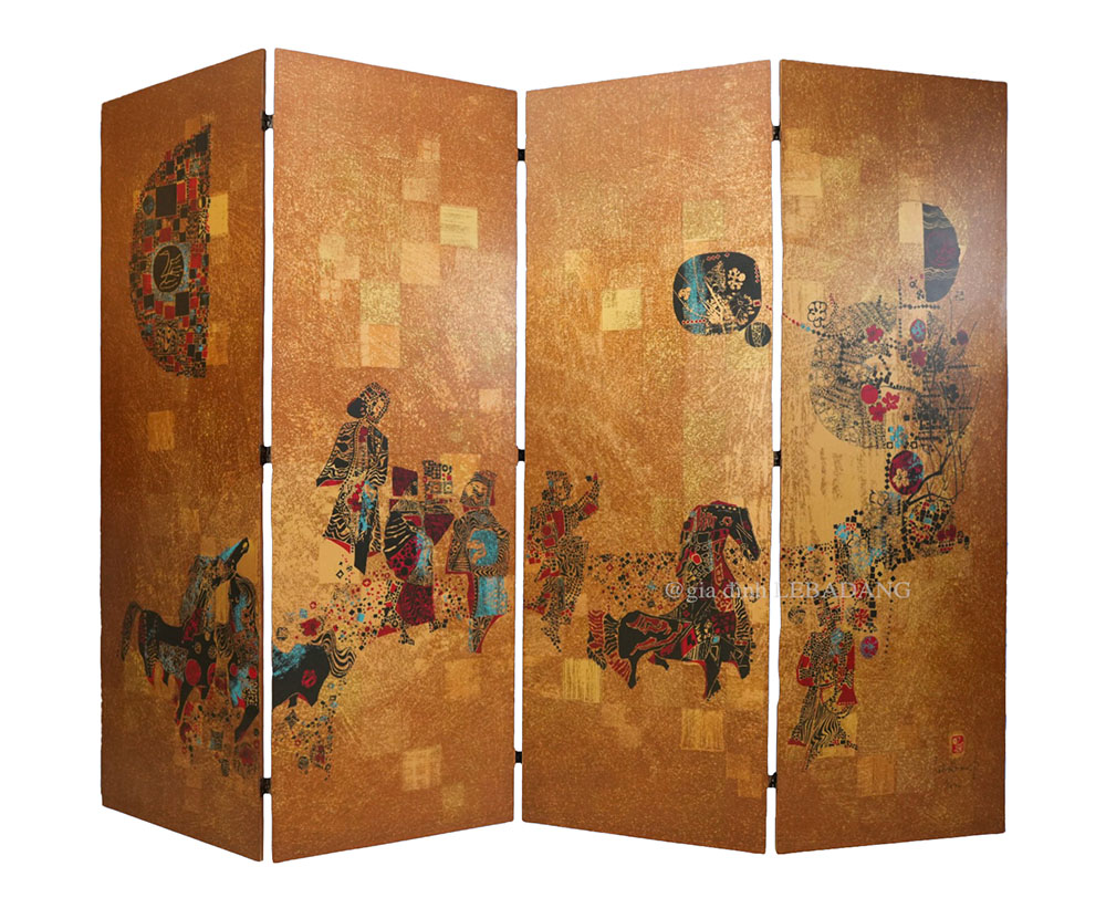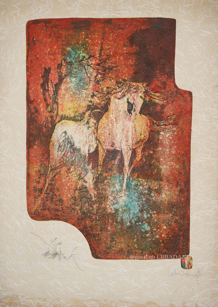 Từ trái sang phải: Ngựa xiếc-76×54(cm)-Thủ ấn họa thạch bản trên giấy cứng; (Bộ tranh 10 Ngựa)-Ngựa 4-kt75 x 54(cm)-Thủ ấn họa thạch bản trên giấy Nhật; Song mã-kt90 x 63(cm)-Thủ ấn họa trên giấy kép Nhật Bản