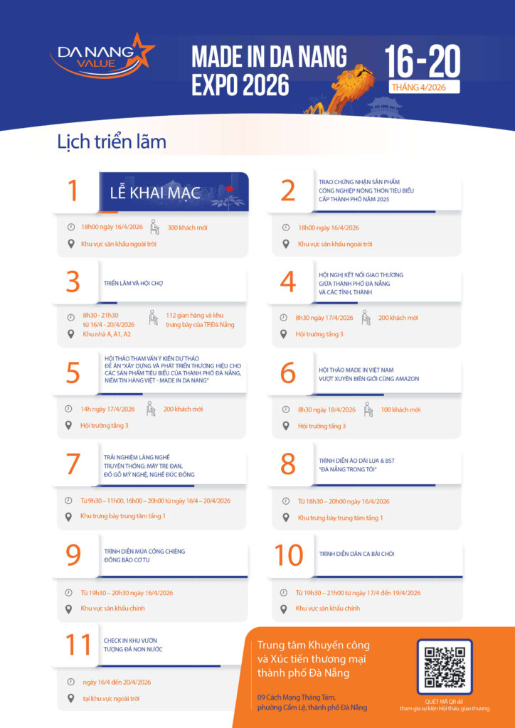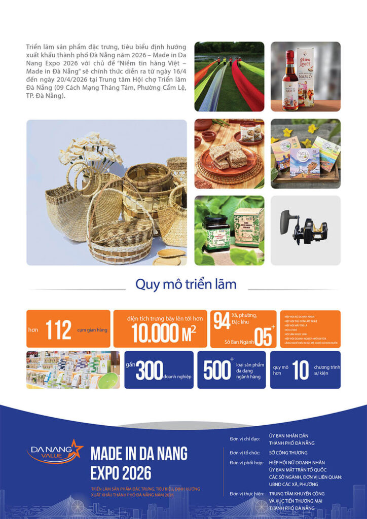 Với quy mô hơn 10.000 m², hơn 112 cụm gian hàng và hàng loạt hoạt động xuyên suốt, Made in Danang Expo 2026 không chỉ là sự kiện xúc tiến thương mại trọng điểm của thành phố mà còn là nơi hội tụ của niềm tin – nơi mỗi sản phẩm kể câu chuyện riêng về Đà Nẵng: năng động, sáng tạo và sẵn sàng vươn ra thế giới.