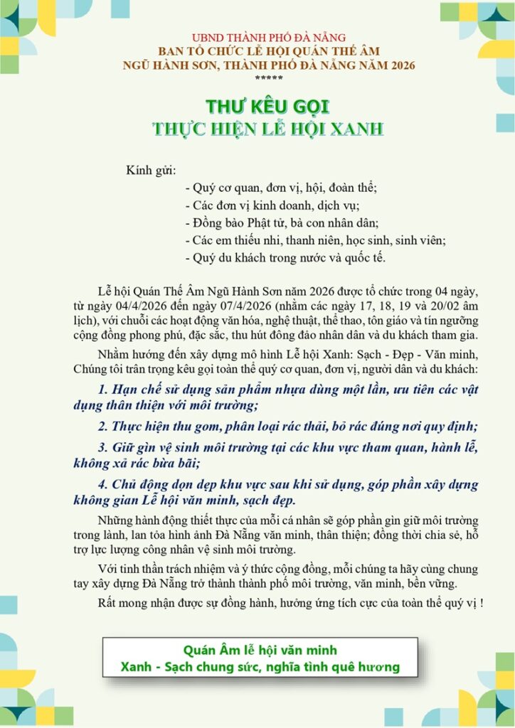 Không chỉ là điểm hẹn văn hóa – tâm linh, Lễ hội Quán Thế Âm, Ngũ Hành Sơn, thành phố Đà Nẵng năm 2026 còn hướng đến xây dựng mô hình “Lễ hội xanh”, kêu gọi cộng đồng cùng chung tay bảo vệ môi trường, giảm thiểu rác thải nhựa, lan tỏa hình ảnh lễ hội sạch – đẹp – văn minh.