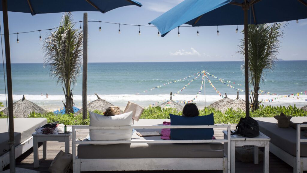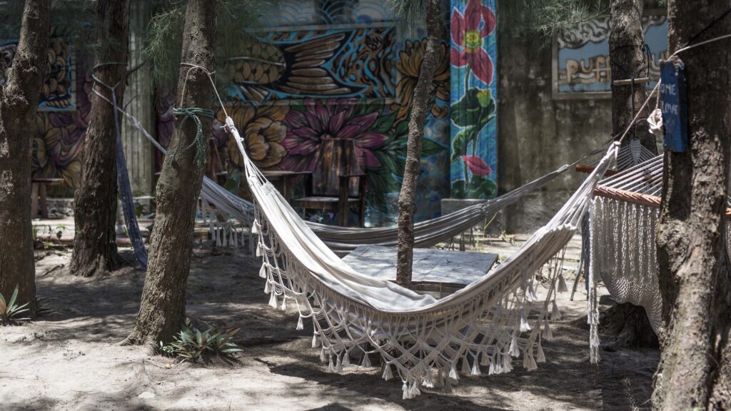Dọc theo bờ biển, những chòi lá ven biển mở ra những khoảng nghỉ nhẹ nhàng, nơi bạn có thể thả hồn theo tiếng sóng, đung đưa trên võng hoặc ngả lưng trên một chiếc ghế có bóng râm. Âm thanh nhịp nhàng của sóng biển, làn gió mặn và ánh nắng ấm áp tạo nên một không gian thư giãn trọn vẹn, đủ để bạn tạm rời xa những nhịp sống bận rộn thường ngày.