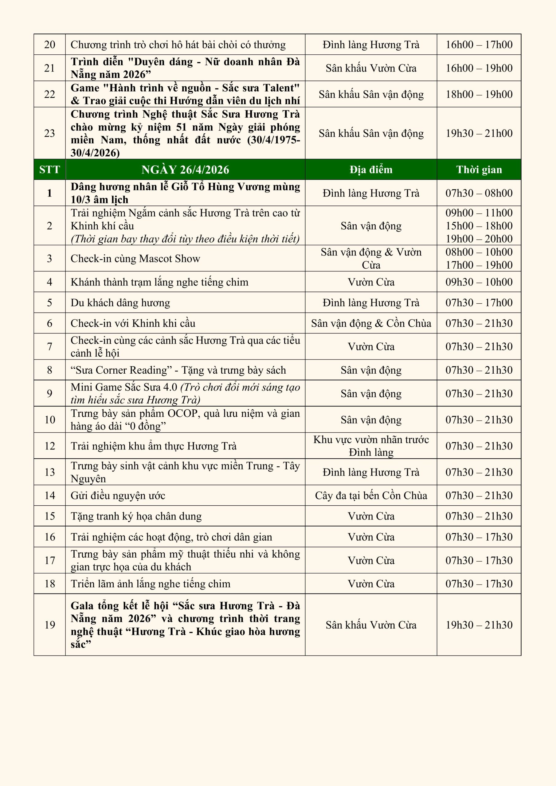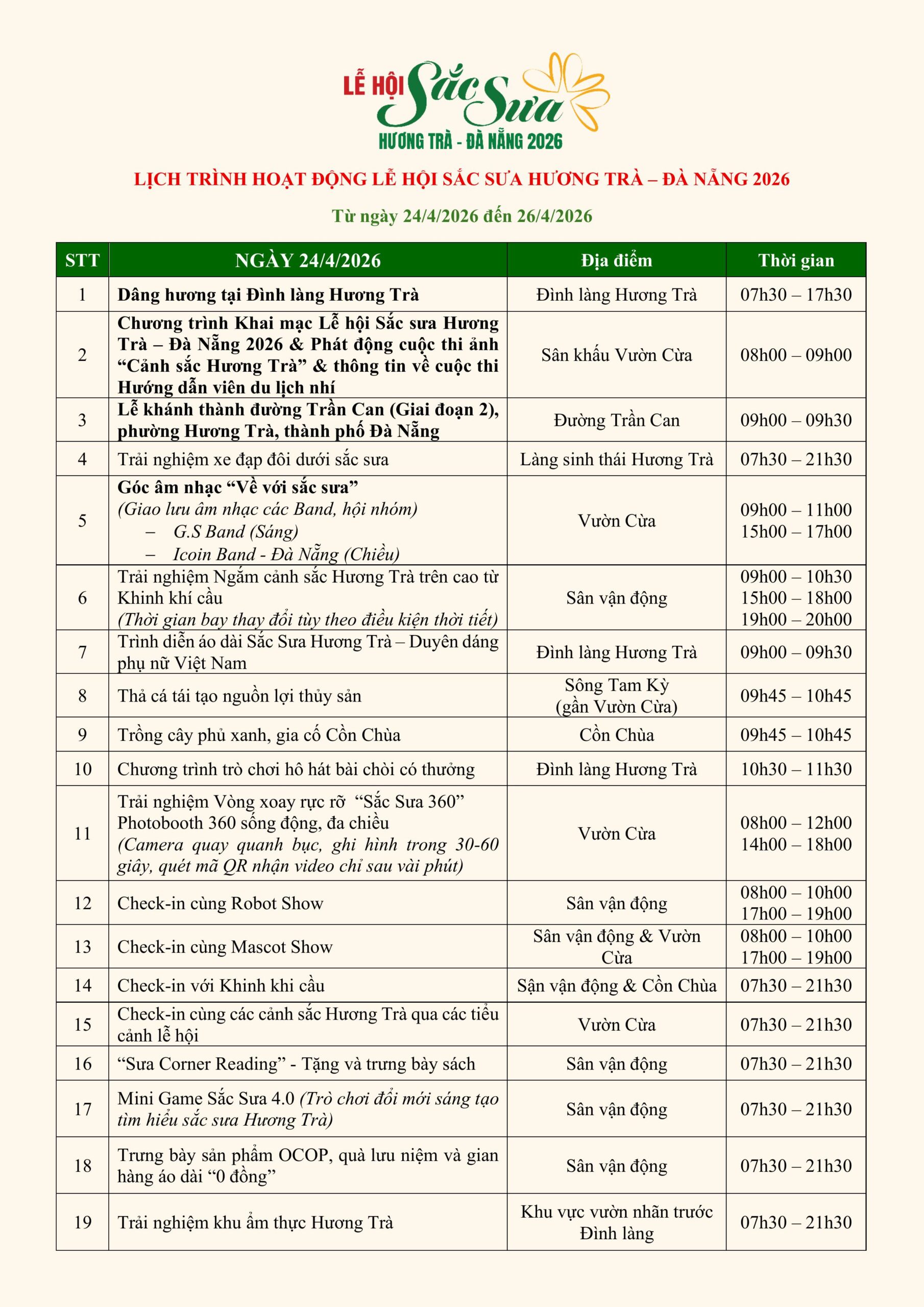 Từ 24/4 đến 26/4/2026, Hương Trà “lên sóng” với một lịch trình dày đặc hoạt động – từ văn hoá, nghệ thuật, thể thao đến vui chơi tương tác – đủ để bạn “quẩy nhẹ – chill sâu – sống ảo full pin” trong một hành trình liền mạch suốt 3 ngày.