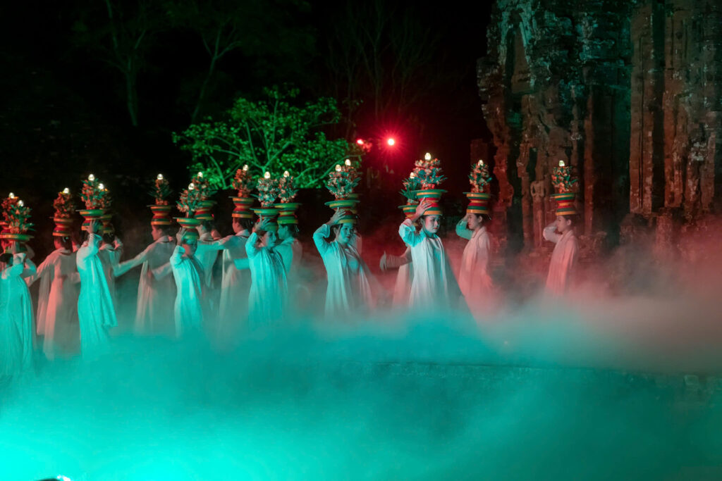 夜のミーソン聖域に漂う神聖な空気、チャンパの舞踊、パラヌン鼓やサラナイ笛の音色が山々に響きわたり、観客を数千年前の世界へ誘います。
