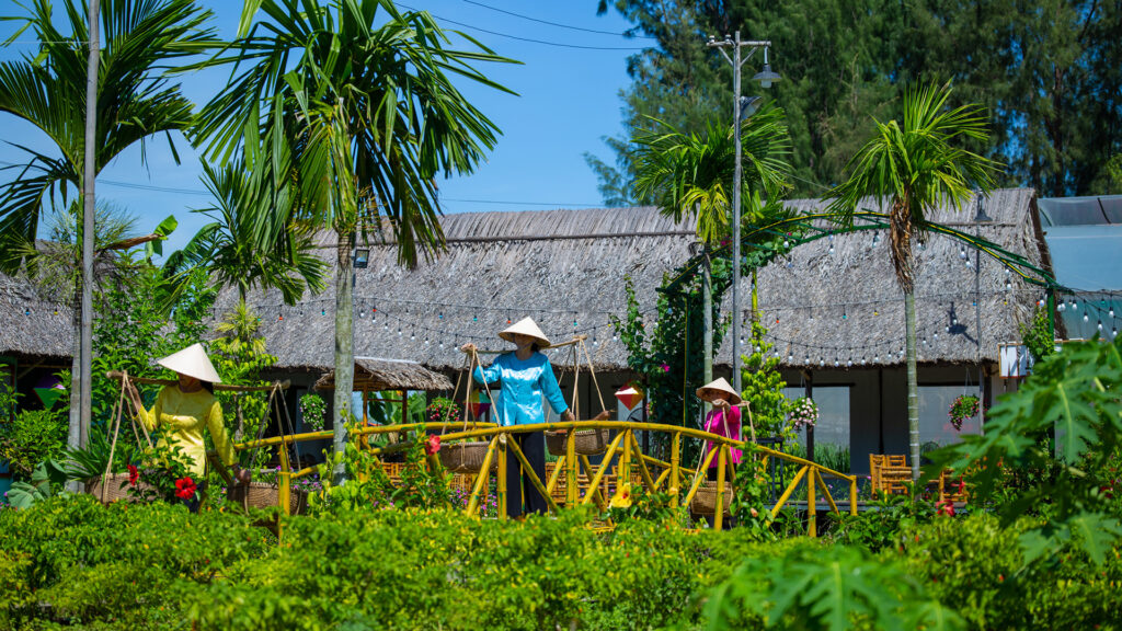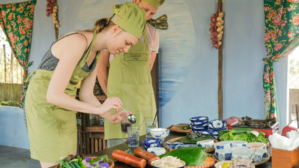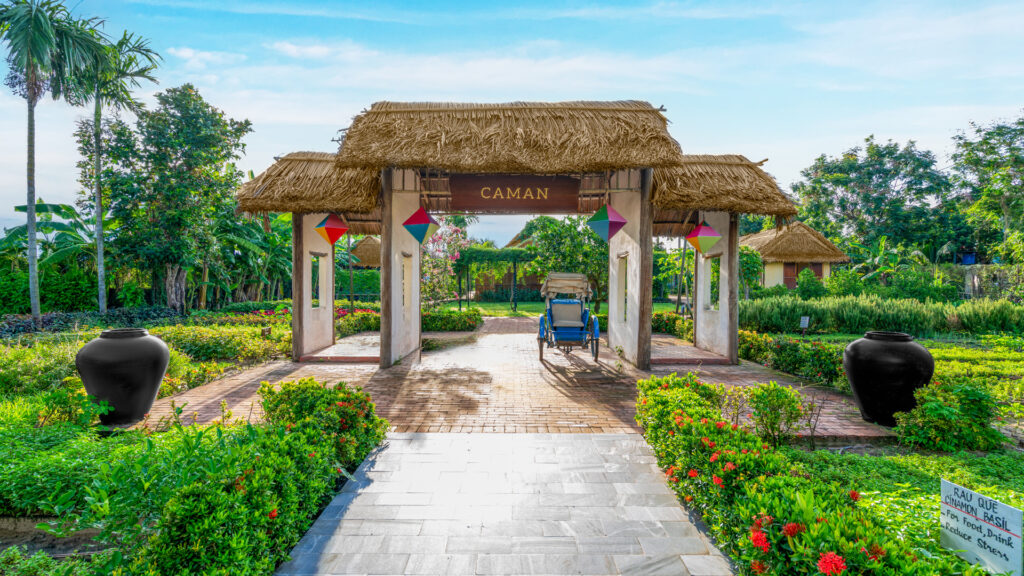 Không xa đó, Caman Village mang đến cảm giác của một làng quê ven sông đúng nghĩa. Những ngôi nhà nhỏ, vườn rau và thảo mộc hữu cơ tạo nên không gian mộc mạc, nơi du khách có thể tham gia các hoạt động sinh hoạt làng quê, học nấu ăn, thưởng thức ẩm thực địa phương và trải nghiệm nhịp sống bình yên của vùng đất Hội An.
