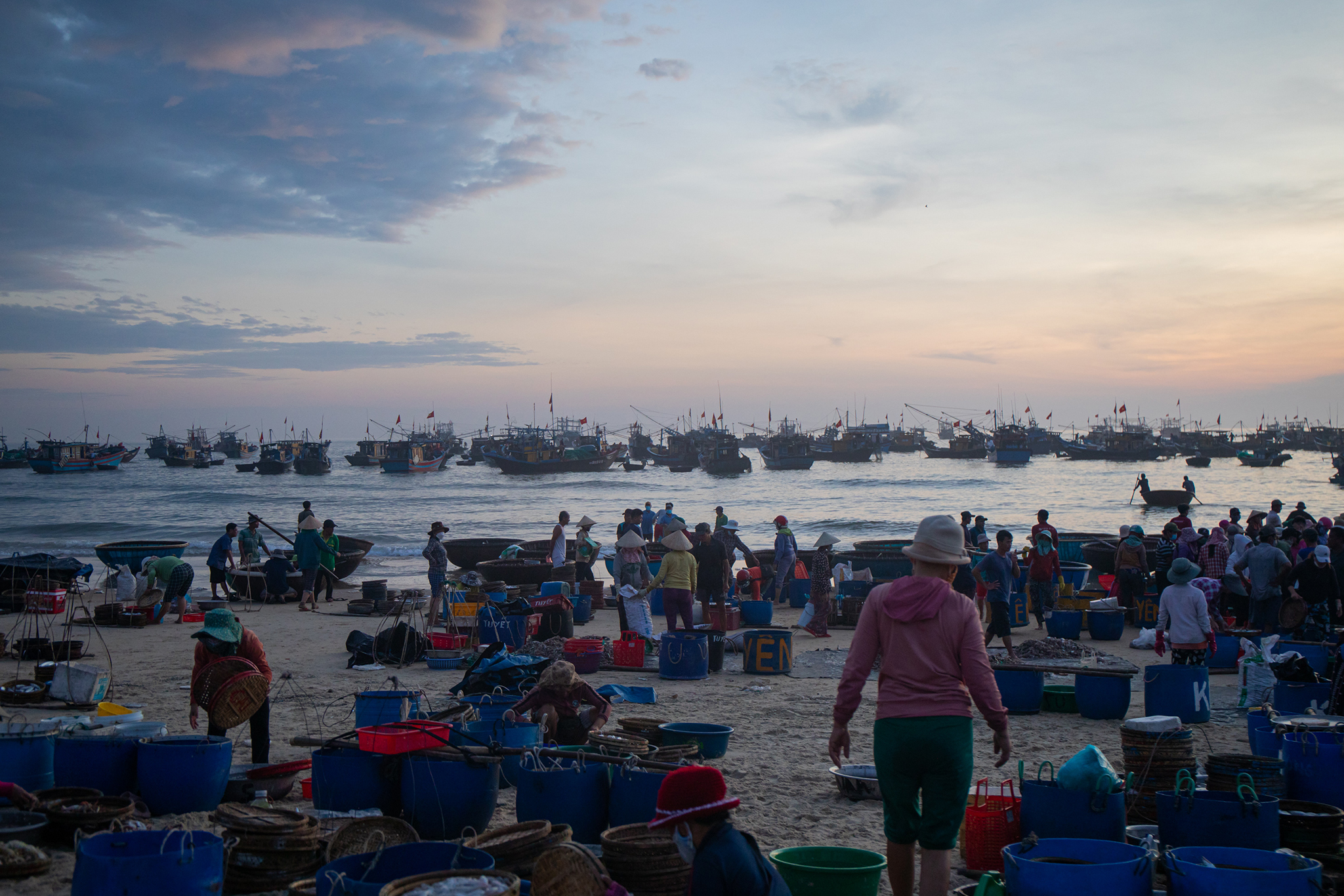 Khi trời còn chưa sáng hẳn, những con thuyền đã lặng lẽ trở về sau một đêm dài trên biển. Không có sự chuẩn bị hay dàn dựng, mọi thứ diễn ra theo đúng nhịp của lao động: người kéo lưới, người gỡ cá, người phân loại từng mẻ hải sản vừa được đưa lên bờ. Không gian dần đầy lên bởi âm thanh – tiếng sóng, tiếng gọi nhau, tiếng trao đổi – tạo nên một nhịp sống vừa khẩn trương, vừa rất đỗi tự nhiên.