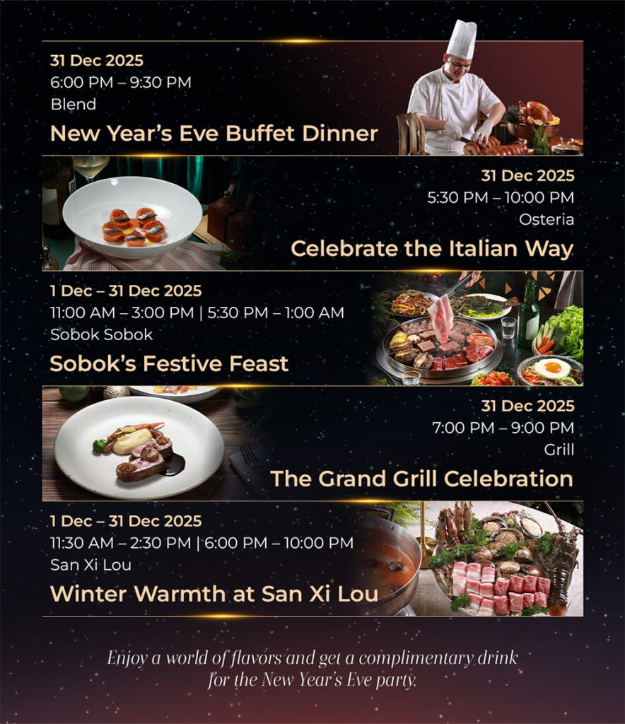 Hành trình vị giác thêm phong phú với ẩm thực đa quốc gia được tuyển chọn và chăm chút tỉ mỉ: từ món Âu hiện đại, hương vị Ý truyền thống, lẩu Tứ Xuyên cay nồng đến BBQ Hàn Quốc hấp dẫn. Các gói đồ uống cao cấp được thiết kế đồng điệu với tinh thần lễ hội, giúp từng khoảnh khắc nâng ly trở nên trọn vẹn khi thời khắc chuyển giao đang đến rất gần.