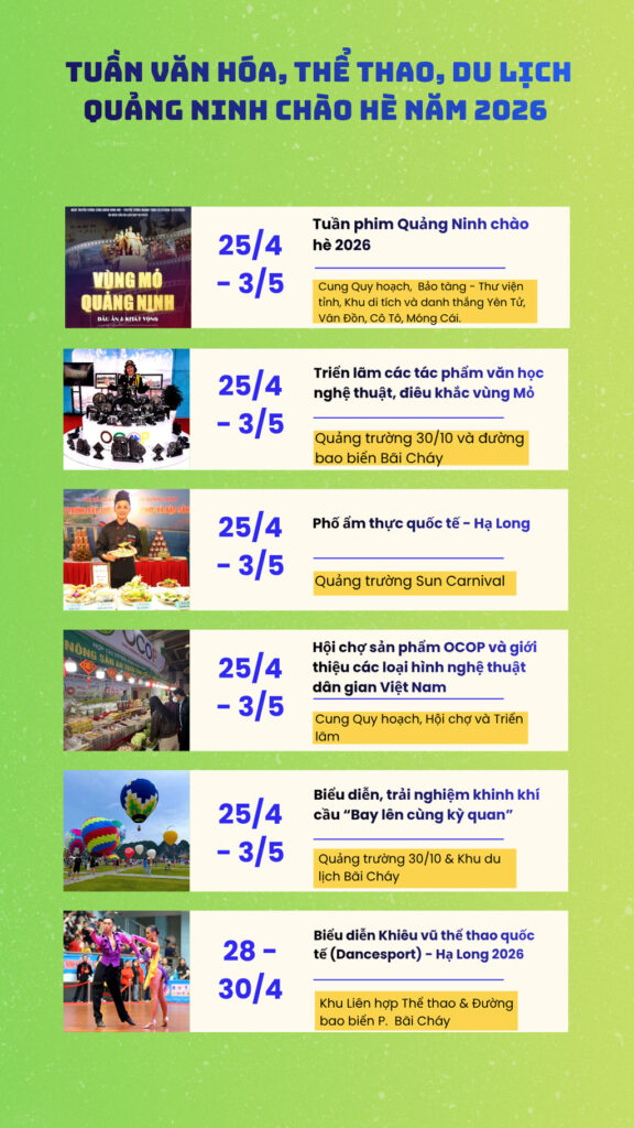 Sở Văn hóa, Thể thao và Du lịch trân trọng thông tin và khuyến khích các doanh nghiệp du lịch, đơn vị lữ hành, cũng như người dân và du khách quan tâm, tham gia trải nghiệm các hoạt động đặc sắc trong khuôn khổ Tuần Văn hóa, Thể thao và Du lịch Quảng Ninh chào hè năm 2026.