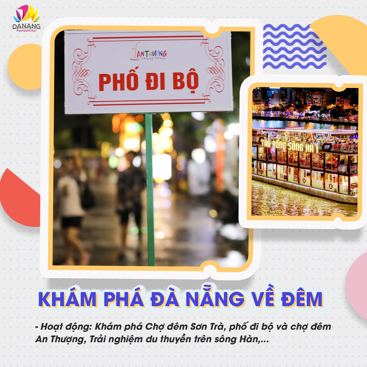 Giữa những địa điểm nổi tiếng để thăm thú, vui chơi ban ngày, Đà Nẵng còn đặc biệt bởi các khu chợ đêm hay các hoạt động veef đêm luôn ấp nập và đông đúc. Tại đây, bạn sẽ được hòa mình vào không khí sôi động của người dân địa phương: những hoạt động vui chơi, mua sắm và thưởng thức ẩm thực đa dạng của dải đất miền Trung xinh đẹp.