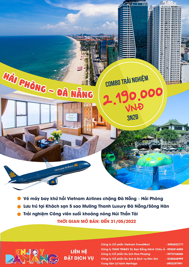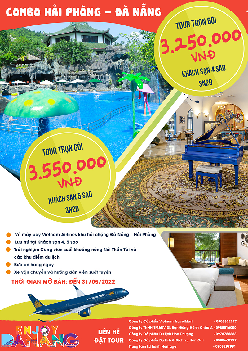 – Gói sản phẩm kích cầu dành thị trường Đông Bắc bộ liên kết đường bay Hải Phòng – Đà Nẵng bao gồm nghỉ dưỡng 5 sao và vé máy bay giá giá 2.190.000 VNĐ/khách nghỉ dưỡng hay có thể lựa chọn mua Tour trọn gói với giá siêu hấp dẫn từ 3.250.000 VNĐ/khách – 3.550.000 VNĐ/khách.