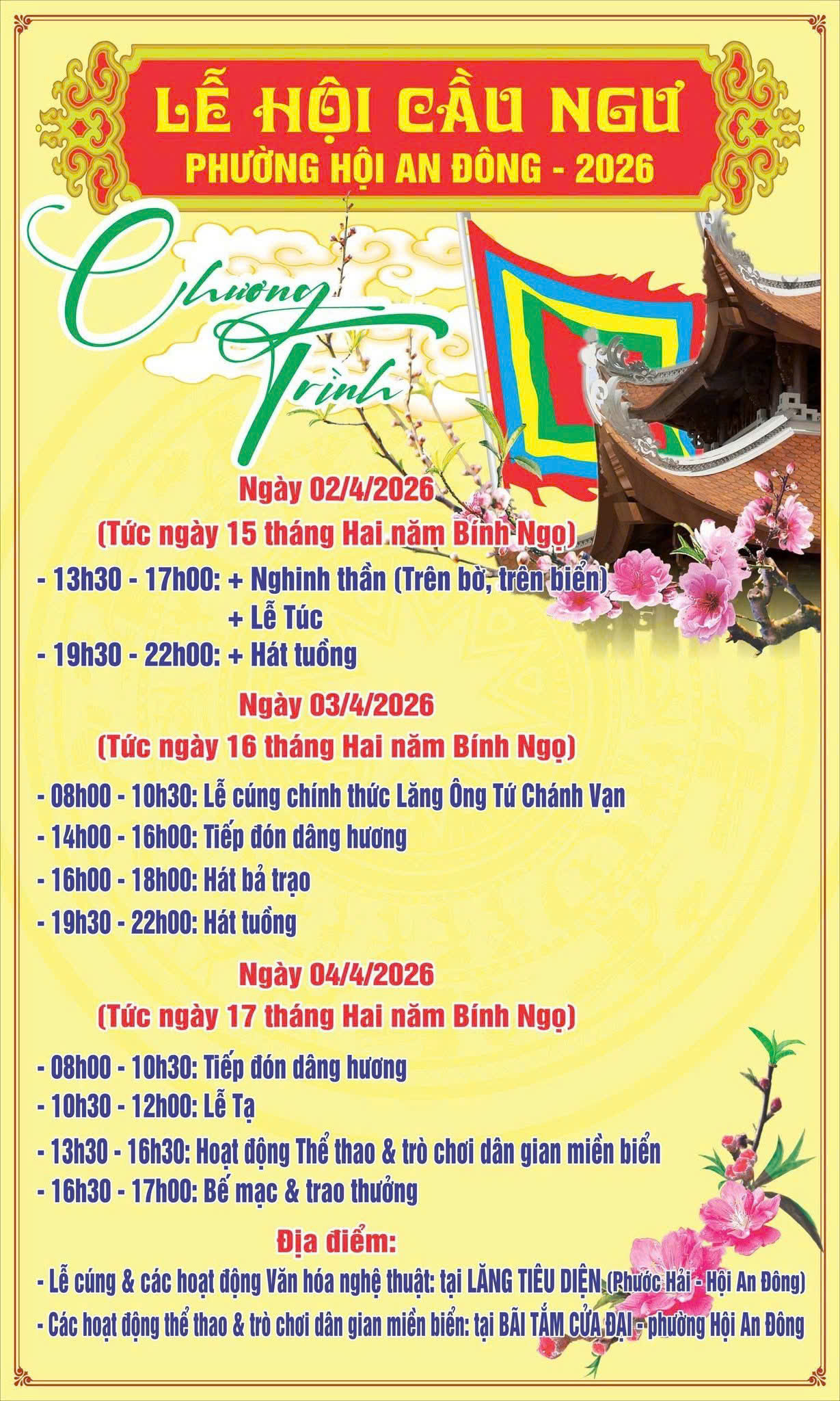 Giữa không gian biển Cửa Đại, nơi những con sóng mang theo ký ức của làng chài, lễ hội không chỉ là một sự kiện diễn ra trong vài ngày, mà là một dòng chảy văn hóa vẫn đang tiếp diễn. Từ ngày 01/4 đến 04/4/2026, tại biển Cửa Đại và Lăng Tiêu Diện (Tổ dân phố Phước Hải), Lễ Cầu ngư phường Hội An Đông trở thành điểm hẹn để bạn bước vào một thế giới rất khác – nơi mọi trải nghiệm đều gắn với biển, với nghề và với niềm tin đã bền bỉ qua nhiều thế hệ.