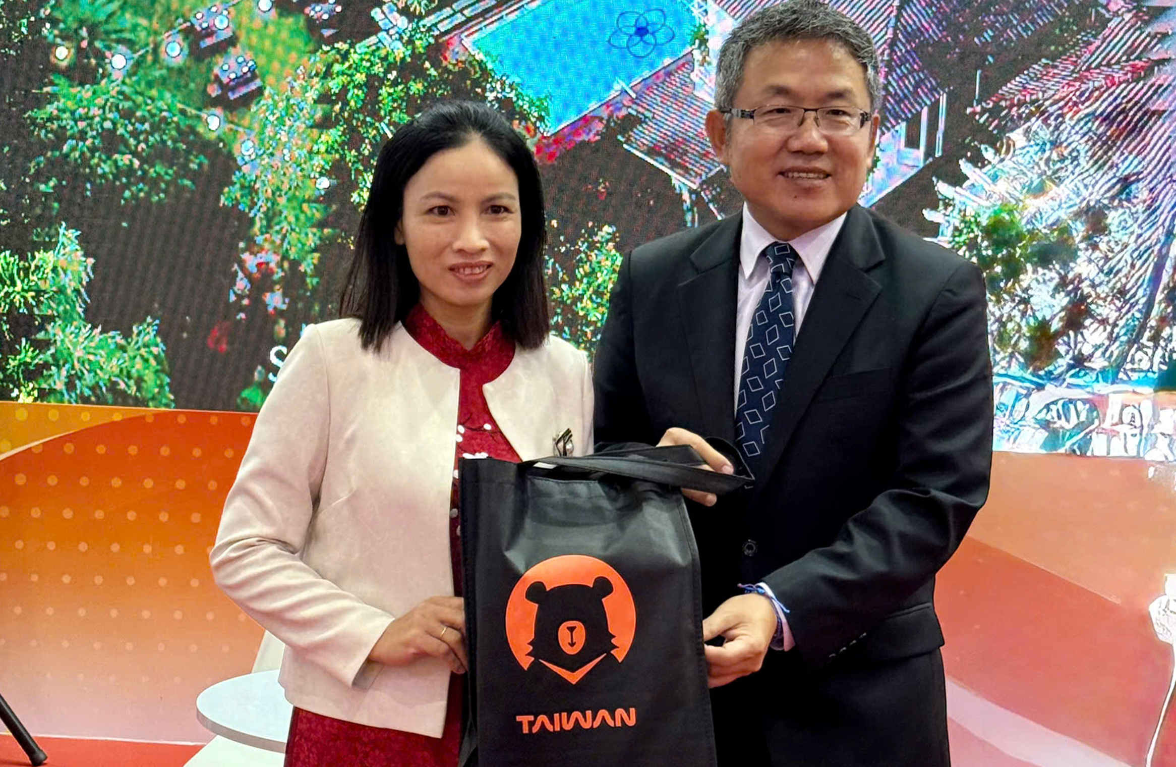 Ông Lưu Thế Trung, Trưởng Đại diện Văn phòng Kinh tế và Văn hoá Đài Bắc tại Việt Nam đến thăm gian hàng du lịch 3 địa phương