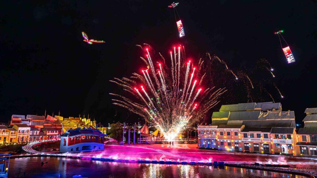Các thiết bị bay kết hợp cùng hệ thống đèn lồng truyền thống đã tạo nên màn drone đèn lồng Rồng – Phượng rực rỡ, biến không gian đêm thành một sân khấu ánh sáng quy mô lớn. Hình ảnh Rồng – Phượng chuyển động trên bầu trời không chỉ mang tính thị giác mạnh mẽ, mà còn gửi gắm thông điệp khai xuân về phú quý, thịnh vượng và hanh thông.
