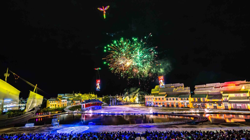Khoảnh khắc cao trào của chương trình là khi đôi Rồng – Phượng “trao” những cánh hoa may mắn từ không trung, tạo nên một nghi thức chúc phúc độc đáo giữa bầu trời đêm Hội An. Hình ảnh những đóa hoa ánh sáng lan tỏa không chỉ mang ý nghĩa biểu tượng cho tài lộc và khởi đầu hanh thông, mà còn khơi dậy sự hào hứng của đông đảo khán giả theo dõi.