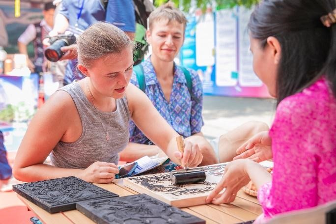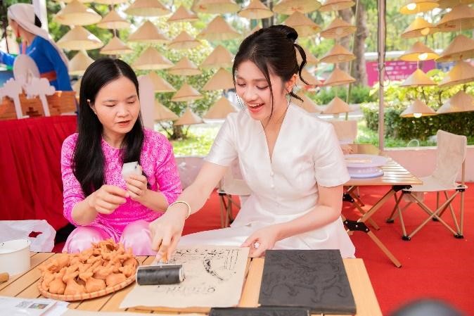 Du khách thích thú trải nghiệm làm gốm và tranh mộc bản
