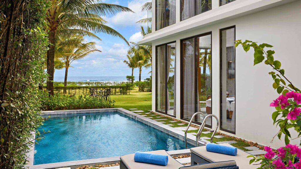 Khu nghỉ dưỡng sở hữu 497 phòng nghỉ và 69 biệt thự hướng biển, tất cả đều được thiết kế với nội thất gỗ sang trọng, không gian thoáng đãng, và ban công mở rộng để đón trọn hơi thở của đại dương. Tôi chọn lưu trú tại biệt thự 3 phòng ngủ đối diện biển – nơi mỗi sáng, ánh bình minh phản chiếu trên mặt nước đánh thức tôi bằng sắc vàng tinh khiết, và mỗi tối, tiếng sóng rì rào bên hiên nhà ru tôi vào giấc ngủ an yên.
