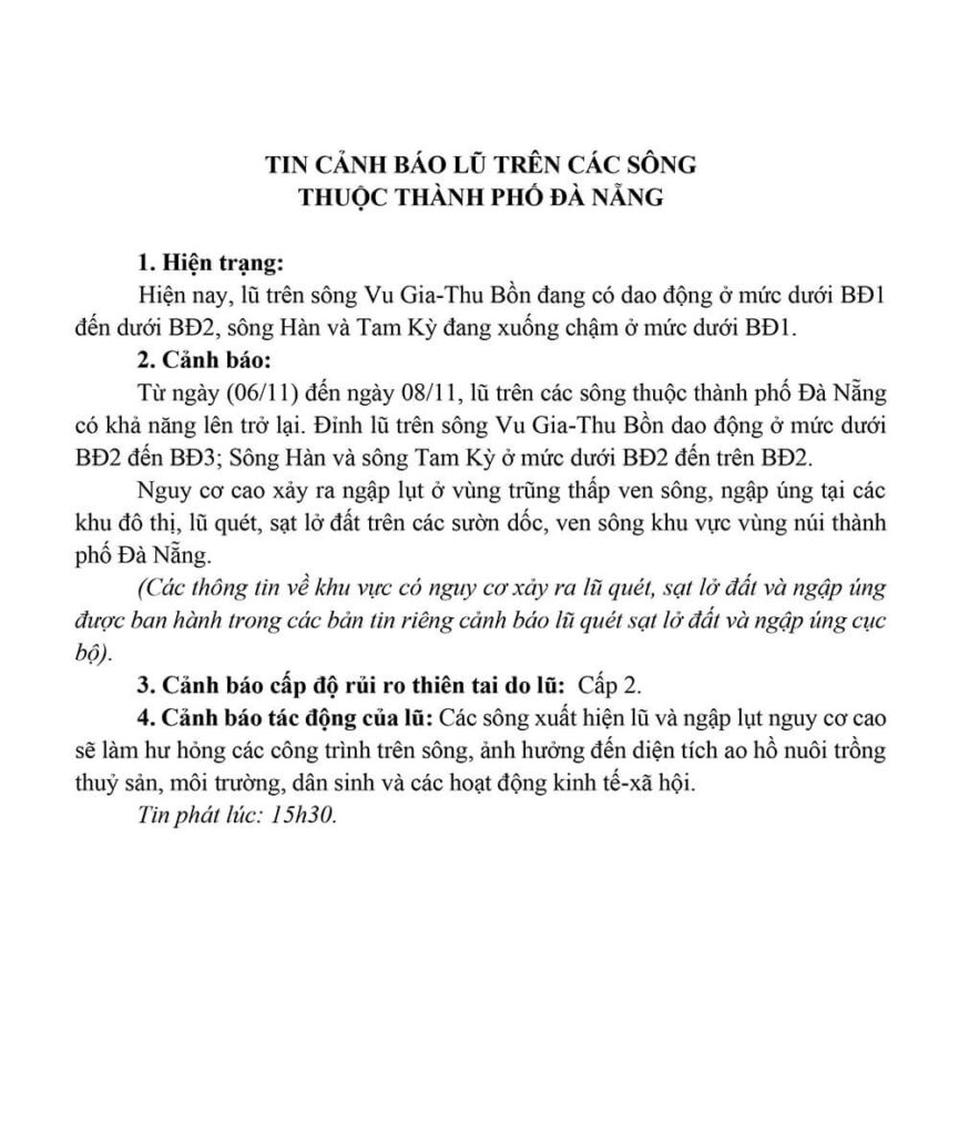 Tin cảnh báo lũ trên các sông thuộc TP. Đà Nẵng
