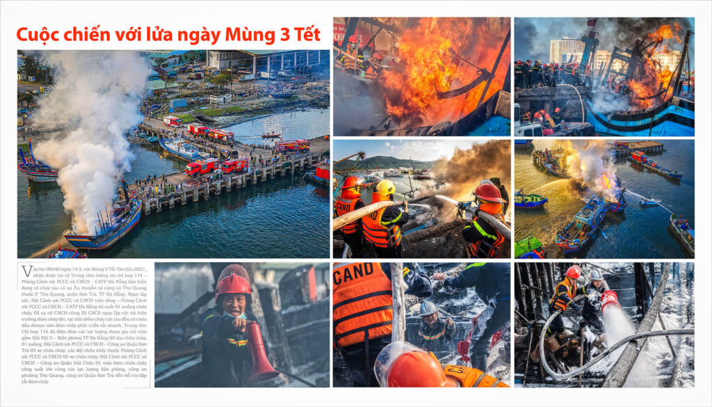 Ở một lát cắt khác của đời sống đô thị, bộ ảnh “Cuộc chiến với lửa ngày mùng 3 Tết” ghi lại khoảnh khắc lực lượng phòng cháy chữa cháy căng mình đối mặt với biển lửa trong những ngày đầu năm. Được trao Huy chương Vàng tại Liên hoan Ảnh Nghệ thuật Nam Trung Bộ & Tây Nguyên lần thứ 27 (2022), loạt tác phẩm mang giá trị tư liệu – nghệ thuật, phản ánh tinh thần quả cảm và trách nhiệm của những con người giữ gìn sự bình yên cho thành phố.