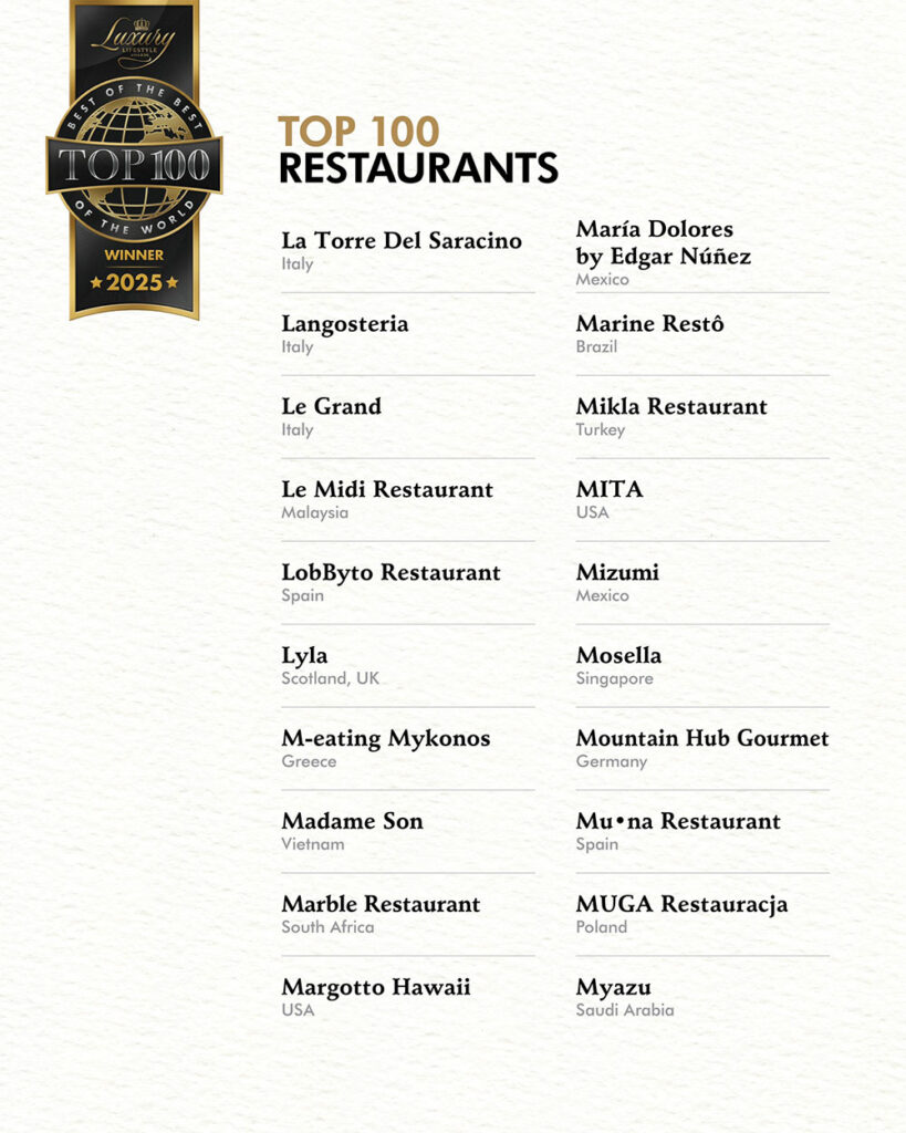 • Luxury Lifestyle Awards 2025: Nhà hàng duy nhất tại Việt Nam được vinh danh trong Top 100 Nhà hàng trên toàn thế giới.