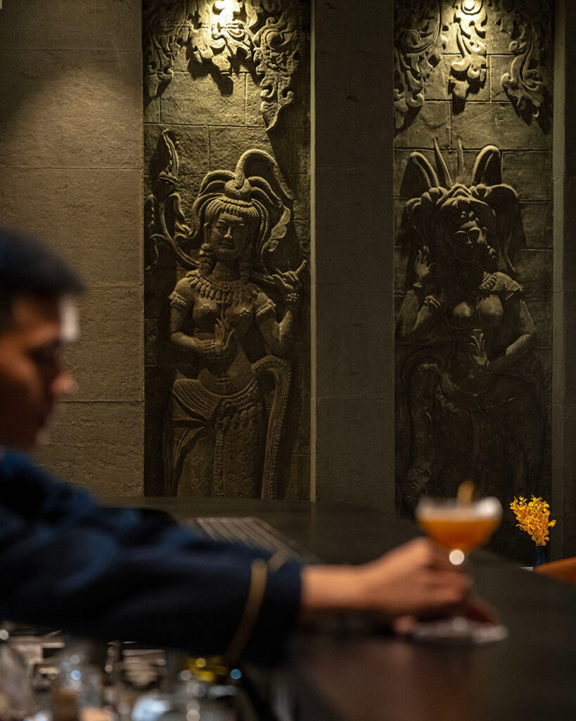 Từ khoảnh khắc bước vào nhà hàng, thực khách sẽ lập tức chìm đắm trong không gian kiến trúc Đông Dương đầy mê hoặc. Phong cách giao thoa tinh tế giữa nét sang trọng, phóng khoáng của kiến trúc Đông Dương cùng vẻ đẹp hoài cổ, huyền bí của Á Đông được thể hiện qua những chiếc ô giấy nghệ thuật, đèn lồng rực rỡ, khung cửa chạm khắc Chăm Pa và các tác phẩm nghệ thuật cổ điển.