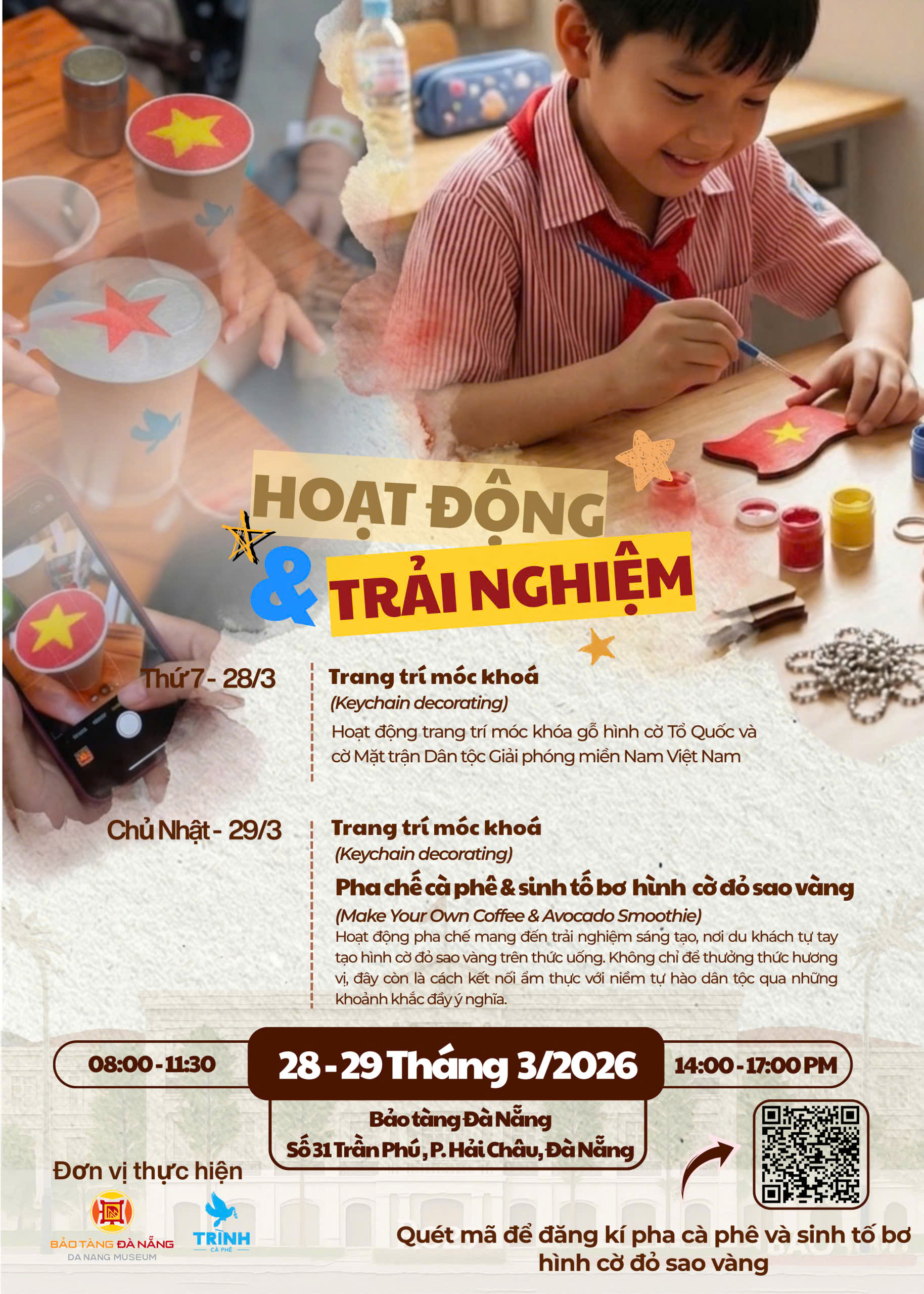 Bên cạnh việc miễn phí vé tham quan ngày 29/3, trong hai ngày 28 – 29/3/2026, Bảo tàng Đà Nẵng còn mở ra chuỗi hoạt động trải nghiệm tương tác, diễn ra từ 08:00–11:30 và 14:00–17:00. Tại đây, du khách có thể tự tay trang trí móc khóa gỗ với hình ảnh cờ Tổ quốc và các biểu tượng lịch sử, hay tham gia pha chế cà phê, sinh tố bơ tạo hình cờ đỏ sao vàng – nơi mỗi trải nghiệm không chỉ dừng lại ở sự sáng tạo mà còn trở thành một cách kết nối nhẹ nhàng với ký ức, văn hóa và niềm tự hào dân tộc. Trong không gian gần gũi và giàu cảm hứng, những khoảnh khắc tự tay tạo nên một sản phẩm nhỏ, thưởng thức một thức uống mang dấu ấn riêng hay lưu giữ lại bằng những khung hình giản dị cũng đủ để hành trình tham quan trở nên trọn vẹn hơn.