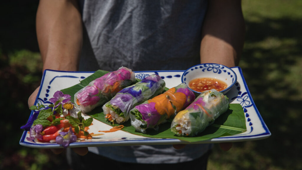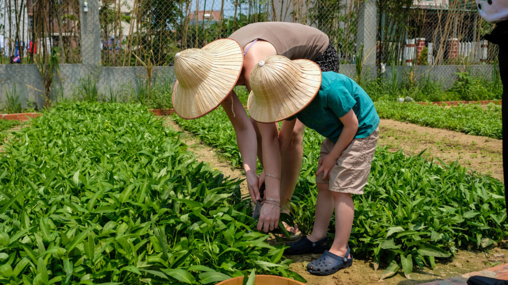 Tại đây, du khách không chỉ quan sát mà thực sự bước vào hành trình từ vườn đến bàn ăn. Một buổi sáng có thể bắt đầu bằng việc xuống ruộng, học cách xới đất, tưới rau bằng đôi gánh tre và thu hoạch những bó rau còn đẫm sương sớm. Sau đó, trong những căn bếp nhỏ giữa khu vườn xanh, du khách cùng đầu bếp địa phương chế biến những món ăn truyền thống – từ Mì Quảng, Bánh xèo, đến các món rau đặc trưng của vùng đất.