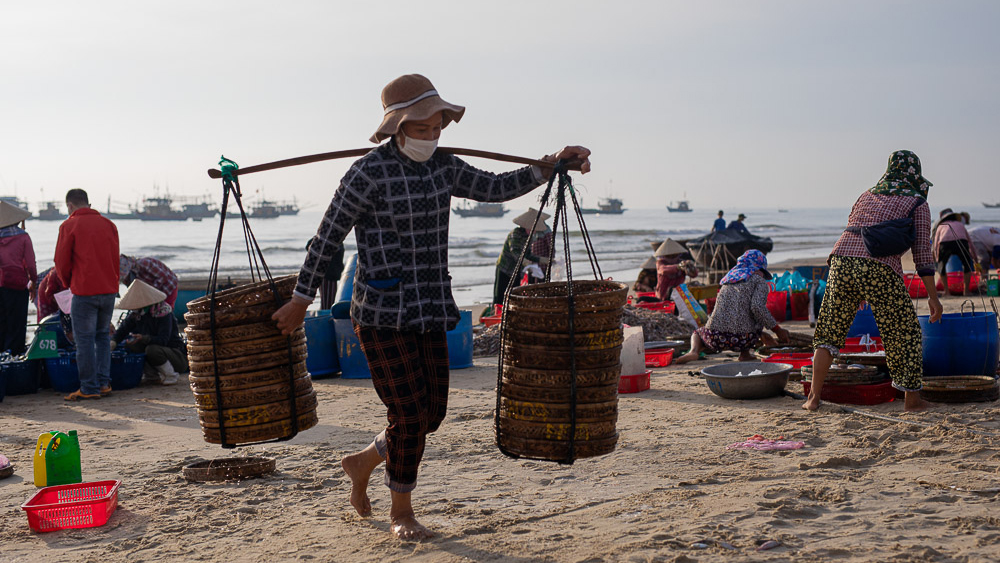 Trước khi mặt trời lên, bờ biển Đà Nẵng đã bắt đầu một ngày mới. Trong ánh sáng nhạt của buổi sớm, những chiếc thuyền đánh cá dần trở về sau một đêm dài lênh đênh trên biển, mang theo những mẻ hải sản tươi rói. Không khí tại bến cá trở nên rộn ràng với tiếng gọi nhau của ngư dân, tiếng sóng vỗ mạn thuyền và mùi mặn mòi của biển cả.